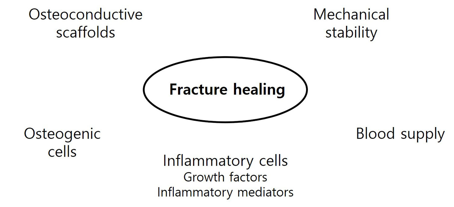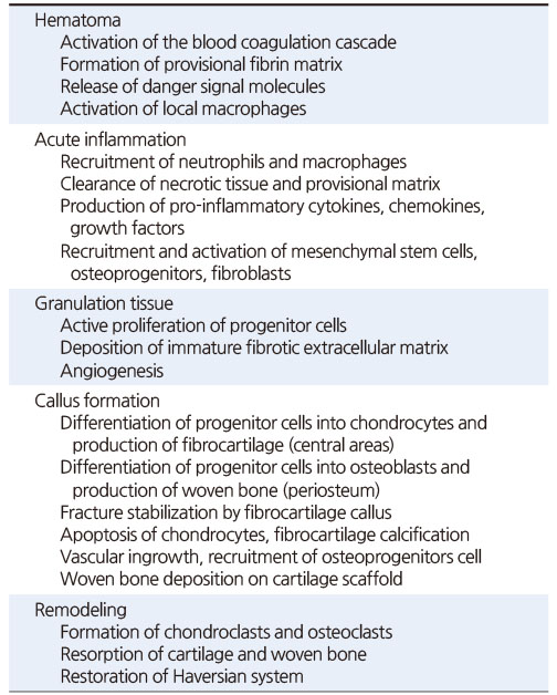 Bone injuries induce an inflammatory response that promotes bone healing. On the other hand, an aberrant process, where inflammation becomes chronic, can inhibit the healing of injured bone. At the first stage of the bone healing process, inflammatory cells, such as neutrophils and macrophages, are assembled and secrete various cytokines, chemokines, and growth factors. During callus formation, cells differentiated from mesenchymal stem cells, such as osteoblasts and chondrocytes, play leading roles in bone healing. Currently, various treatment modalities have been developed through the known mechanism of bone healing, and the clinical outcomes of bone defect and fracture nonunion have been good.
