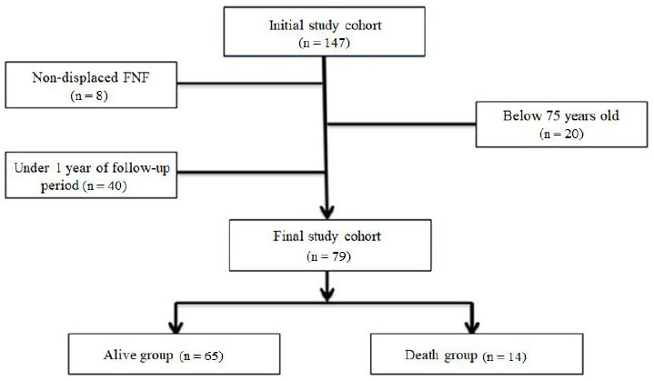 2018년 12월부터 2020년 6월까지 본원에서 대퇴골 경부 골절로 진단된 147예에 대하여 고관절 전치환술을 시행하였다. 본 연구의 참여 대상자 선정 기준은 (1) Garden stage III 또는 IV에 해당하는 전위성 대퇴골 경부 골절, (2) 연령이 75세 이상, (3) 추시 기간은 1년 이상으로 설정하였다. 147예 중 비전위성 대퇴골 경부 골절 8예, 75세 미만인 20예, 추시 기간이 1년 미만인 40예는 제외되어 최종적으로 79예가 등록되었고, 65예가 생존하였으며 14예가 사망하였다(Fig. 1). 본 연구는 서울의료원 의생명윤리위원회(Institutional Review Board, IRB)의 승인을 받았으며(IRB No. 2021-02-008), 후향적 의무기록 연구로 환자 서면동의는 IRB에 의해 면제 받았다.