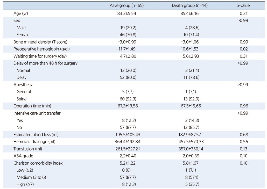 최종적으로 79예를 대상으로 분석이 진행되었고, 생존군과 사망군의 두 그룹으로 나뉘었다. 평균 추적 기간은 15.0±8.43개월이었고, 사망률은 17.7% (14/79)였다. 사망한 환자들은 수술 후 평균 8.7±6.24개월에 사망하였다. 2예는 수술 후 1개월 이내에 사망하였으며 수술 후 1년 이내에 7명의 환자들이 사망하였다. 생존군과 사망군 간 연령, 성별 및 골밀도 검사 결과는 차이가 없었다. 또한 생존군과 사망군 간 마취 방법, 수술 시간, 추정 출혈량, 배액관 배액량, 입원 후 수술까지 경과 시간 및 수술 후 중환자실 입실 여부도 유의한 차이는 없었다(Table 1).