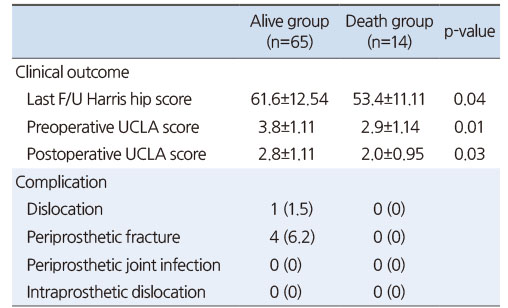 The mean follow-up period was 15.0±8.43 months and a total of one dislocation case was observed. The mortality rate was 17.7% (14/79), and it was especially higher in patients with a past medical history of malignancy (odds ratio [OR]=7.18, p=0.03) or a cognitive disorder such as dementia (OR=5.48, p=0.03). Preoperative low initial hemoglobin levels (OR=0.65, p=0.04) and low UCLA (Uni-versity of California at Los Angeles) score (OR=0.47, p=0.02) were also associated with mortality.