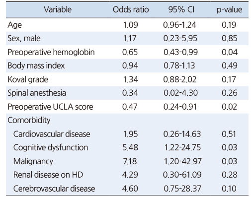 한편, Bozic 등17)은 미국 메디케어 인구의 5% 샘플을 사용하여 수술 후 90일 사망률에 대한 위험비(hazard ratio, HR)를 식별하기 위해 다변수 공회귀 분석을 사용하는 연구를 수행하였다. 그 결과 악성종양(HR=1.00), 전이암(HR=3.14), 편마비 또는 하반신마비(HR=2.62), 심혈관질환(HR=2.11), 인지기능장애(HR=2.04), 신장질환(HR=1.98), 정신질환(HR=1.85), 뇌혈관질환(HR=1.40), 만성 폐질환(HR=1.32) 등의 질환에서 통계적으로 유의하게 사망률과 연관이 있음이 보고되었다. 본 연구에서는 악성종양(OR=7.18, p=0.03)과 인지기능장애(OR=5.48, p=0.03)의 병력이 유의하게 사망률 증가와 관련이 있음을 확인하였다. 아울러 Kawai 등18)의 연구와 동일하게 수술 전 UCLA 점수 확인을 통해 환자의 수상 전 보행 능력과 낮은 사망률 사이의 연관성을 확인할 수 있었다(OR=0.47, p=0.02).