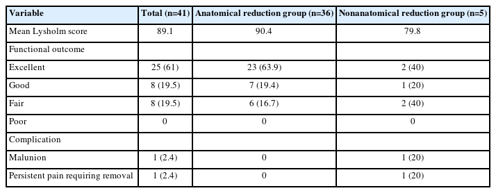 The clinical outcomes were compared between the anatomical and nonanatomical reduction groups (