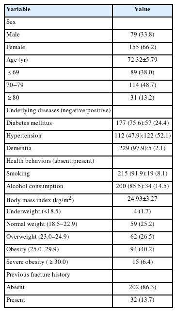 BMI was categorized using Korean Society for the Study of Obesity criteria. BMD was classified per WHO criteria: normal (T>–1.0), osteopenia (–1.0 to –2.5), and osteoporosis (T≤–2.5). Previous fracture history was included.