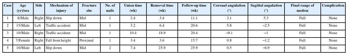 The mean age of the patients was 10.0 years (range, 7 to 15 years). The mean time to radiographic union was 5.4 weeks (range, 2.4 to 10.4 weeks). The mean coronal angulation was 0.2° (range, −9.1° to 5.8°), while the mean sagittal angulation was −1.3° (range, −6.9° to 5.3°). No cases of infection, nerve injury, or nail migration were observed during the follow-up period. At the final follow-up assessment, all patients demonstrated full shoulder and elbow ROM, with no residual deformity or pain reported.