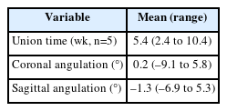 Table 1). The mechanisms of injury consisted of falls from height in one patient, a traffic accident in two, and a slip down in two. The mean follow-up period was 18.7 weeks (range, 11.1–25.9 weeks). The mean bone union time was 5.4 weeks (range, 2.4–10.4 weeks). At the final follow-up, the mean coronal (varus/valgus) angulation was 0.2° (range, –9.1° to 5.8°), and the mean sagittal (anterior/posterior) angulation was –1.3° (range, –6.9° to 5.3°) (