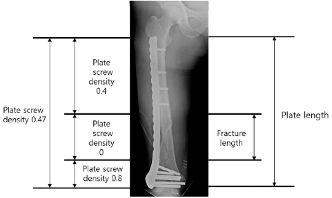 Appropriate plate length and plate-screw density after minimally invasive plate osteosynthesis using a locking plate in osteoporotic distal femur fractures.