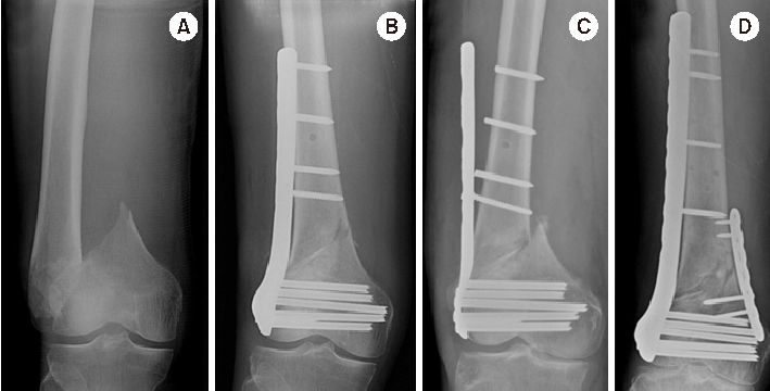 (A) Distal femur fracture in a 70-year-old male. (B) Postoperative anteroposterior radiograph after minimally invasive locked plating. (C) Fixation failure along with broken locking screws two months after surgery. (D) Anteroposterior radiograph seven months after double plating showing bony union.