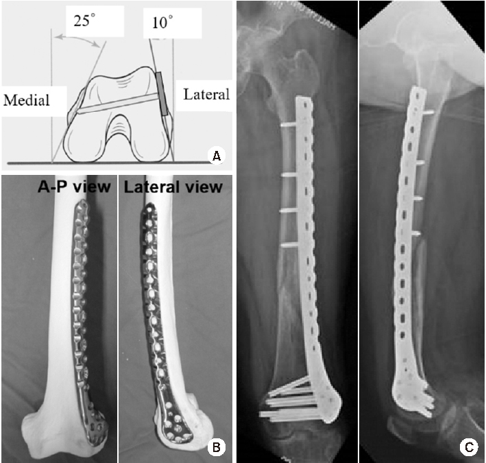 (A) Schematic diagram showing the axial shape of the distal femur and the appropriate length of distal locking screw. (B) Anteroposterior (A–P) and lateral photos showing the appropriate position of the lateral anatomical locking plate in the distal femur model. (C) A–P and lateral radiographs showing the appropriate position of the locking plate fixed in a distal femur fracture of a 72-year-old female patient.