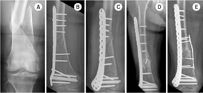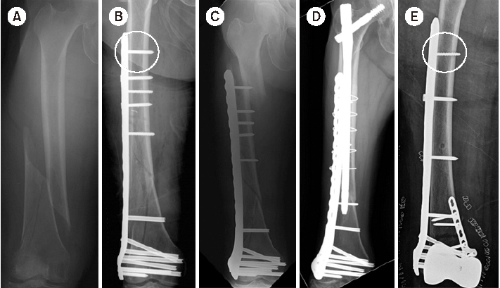 (A) Radiograph of a distal femur fracture of a 74-year-old female after a ground-level fall. (B) Postoperative radiograph after a closed reduction and minimally invasive locked plating. (C) Six-week postoperative radiograph showing a stress riser fracture around the outermost locking screw after slip-down injury. (D) Radiograph showing bony union two years after overlapping intramedullary nailing. (E) Postoperative radiograph showing locked plating using a conventional cortical screw instead of a locking screw as a proximal outermost screw to minimize the stress riser.
