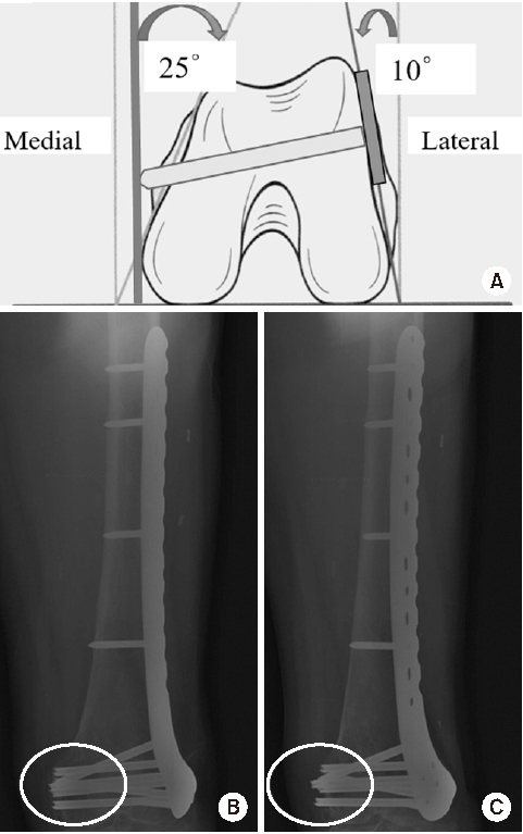 (A) Schematic diagram showing the axial shape of the distal femur and the protrusion of distal locking screw. (B) True anteroposterior radiograph showing that the lengths of the distal locking screws appear to be appropriate. (C) Radiograph taken after rotating a thigh approximately 25° internally, showing the protrusion of multiple screws across the medial cortex.