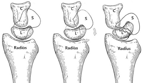 DISI (dorsal intercalated segment instability) caused by the humpback deformity of the scaphoid nonunion (C: capitate, L: lunate, S: scaphoid).