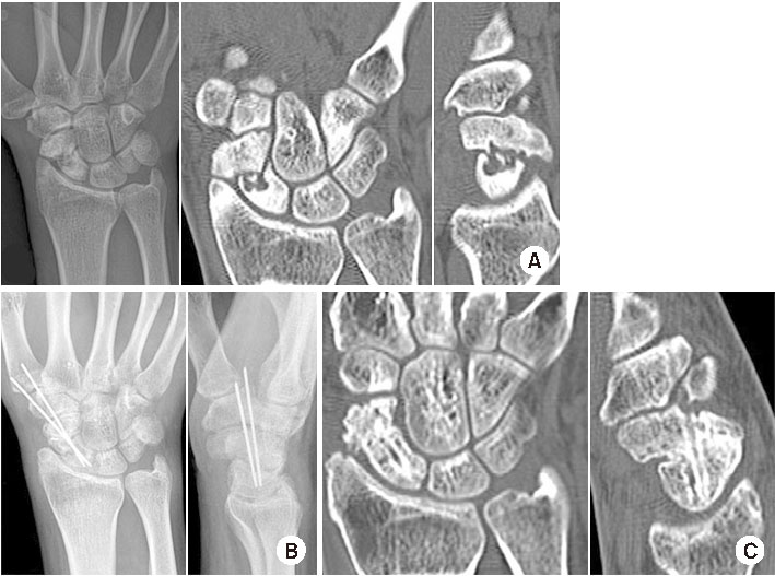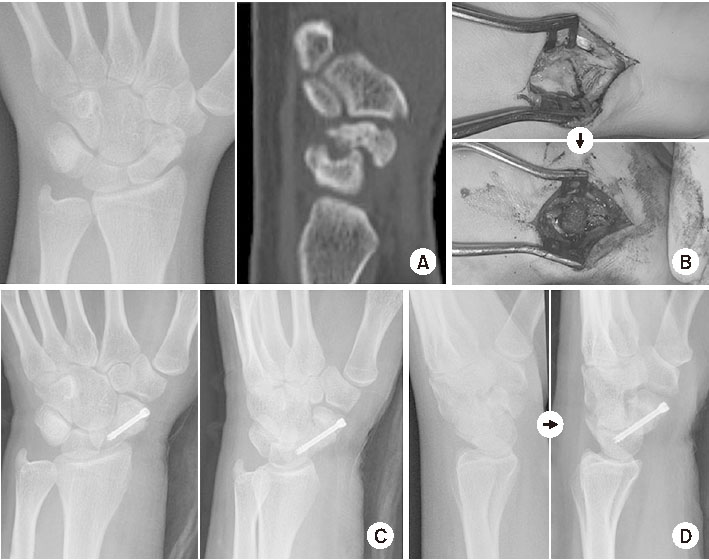최근에는 관절경을 이용한 최소 침습적 수술이 널리 보급되면서 전위성 골절을 관절경 보조하에 정복하고 경피적 나사못 고정을 하는 술식도 보고되었다.34,35) 관절경 보조 술식은 주상골의 변형이 심하지 않은 불유합 골절에서도 사용될 수 있다. 관절경 술식의 장점은 최소 침습적이기 때문에 주상골 주위 혈관 손상을 줄일 수 있고, 동반된 연부조직 손상을 평가하여 함께 치료할 수 있다.35)