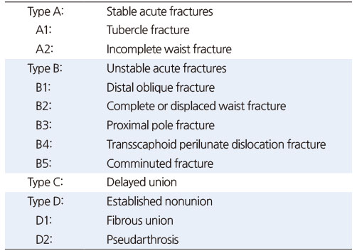주상골 골절의 분류로는 해부학적 위치에 따라 구분하는 Russe 분류,15) Mayo 분류와 골절의 안정성을 기준으로 하는 Herbert 분류16)가 가장 널리 쓰인다. 이 중 Herbert 분류는 보존적 치료와 수술적 치료를 결정하는 데에 중요한 참고가 될 수 있다(Table 1). 결절(tubercle) 골절과 허리부의 불완전 골절은 안정형 골절인 A형에 해당하므로 보존적 치료가 가능하나, B형, C형, D형은 불안정형 골절 또는 지연유합, 불유합 골절이기 때문에 수술적 치료가 필요하다.