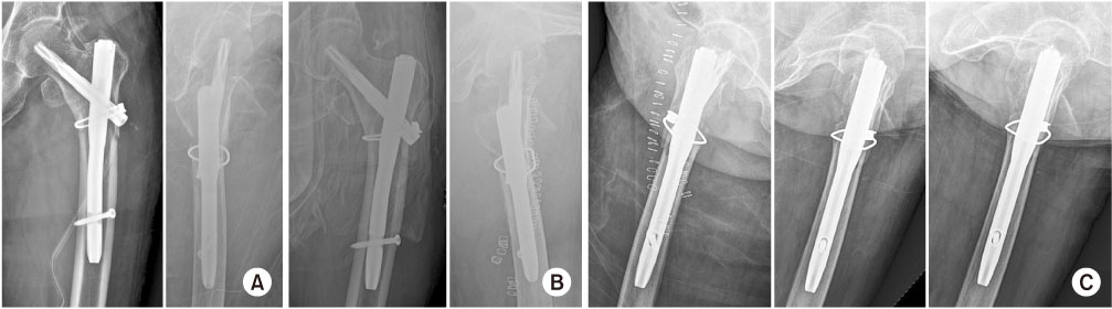 (A) Simple radiograph of left femur anteroposterior (AP) and lateral showed the reduction state of intertrochanter femoral fracture with proximal femoral nail anti-rotation (PFNA) with drain insertion state and anterior and superior migration of lesser trochanter with sharp inferior margin. (B) Postoperative simple radiograph of the left femur AP and lateral showed a reduction of an intertrochanteric femoral fracture with the PFNA. (C) Follow-up postoperative radiograph until discharge showed gradual migration of the lesser trochanter superior and anterior compared to the right after surgery.