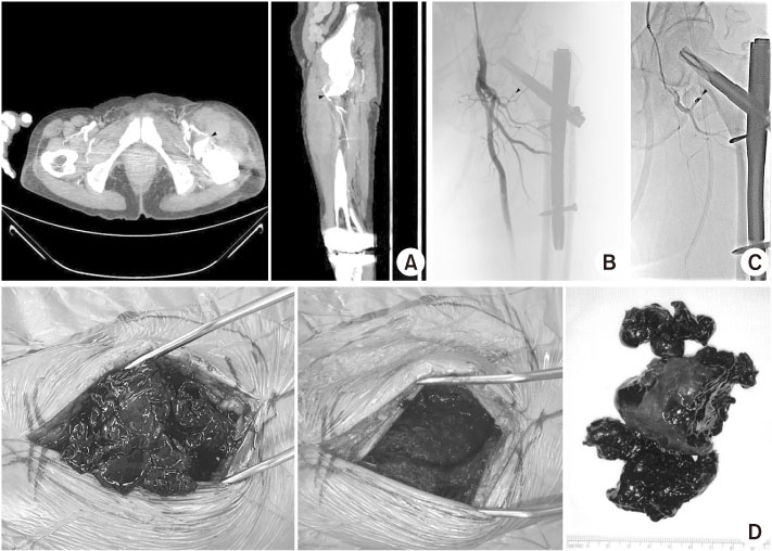(A) Computed tomographic angiography showed a massive hematoma near the branch of lateral circumflex femoral artery irritated by the sharp inferior margin of the lesser trochanter that was displaced superior and anterior (arrowheads). (B) Percutaneous transcatheter angiogram showed cutting of the ascending branch of the lateral circumflex femoral artery because of the sharp inferior margin of the displaced lesser trochanter (arrowhead). (C) After superselection of the bleeding artery using a microcatheter and guidewire, embolization of the bleeding artery was done using micro-coil (3.2 mm, 1×; 4.2 mm, 1×) (arrowhead). No extravasation of the left deep femoral artery was observed in the post-embolization angiogram. (D) Surgical evacuation of the hematoma near the vastus lateralis and intermedius was done under spinal anesthesia.