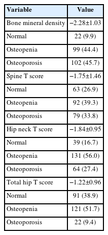 BMI was categorized using Korean Society for the Study of Obesity criteria. BMD was classified per WHO criteria: normal (T>–1.0), osteopenia (–1.0 to –2.5), and osteoporosis (T≤–2.5). Previous fracture history was included.