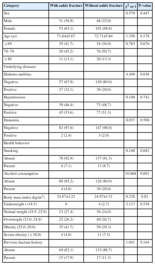 However, diabetes mellitus was significantly associated with ankle fracture occurrence (P=0.038). Alcohol consumption also showed a significant association (P=0.001) (