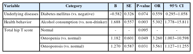 Total hip osteopenia (T-score between –1.0 and –2.5) and osteoporosis (T-score≤–2.5) were independently associated with increased fracture risk compared to individuals with normal BMD (T-score>–1.0), the reference group. The odds ratio for osteopenia was 3.260 (95% CI, 1.003–10.598; P=0.049) and for osteoporosis was 3.561 (95% CI, 1.127–11.255; P=0.031).