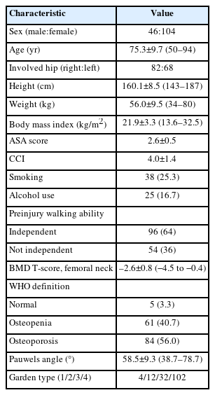 Table 2). Among the 150 patients, women comprised 69.3%, and the mean age was 75.3 years (range, 50–94 years). The mean femoral neck BMD T-score was −2.6 (range, −4.5 to −0.4). According to the WHO criteria, 96.7% of the patients exhibited either osteopenia (40.7%) or osteoporosis (56.0%). The mean Pauwels angle was 58.5° (range, 38.7°–78.7°). Most fractures were displaced and classified as Garden types 3 or 4 (89%).