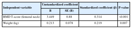 Table 3). No variable exhibited a variance inflation factor ≥2, indicating the absence of multicollinearity. Higher femoral neck BMD T-scores and greater body weight were independently associated with an increase in the Pauwels angle in low-energy FNFs (