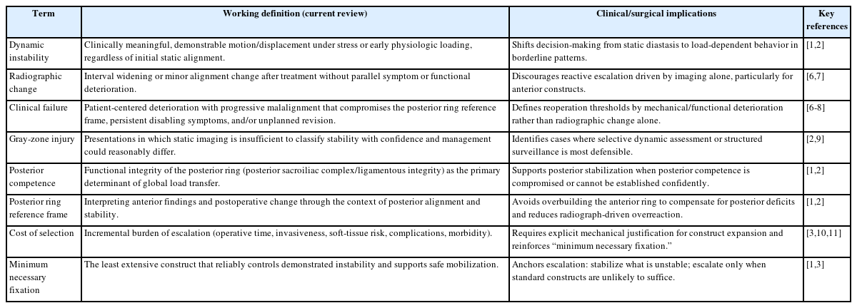2]. In this framework, clinically relevant motion refers to reproducible stress- or load-dependent ring motion that plausibly threatens the maintenance of the posterior ring reference frame and/or delays mobilization and rehabilitation. Key working definitions and decision-linked terminology used throughout this review are summarized in