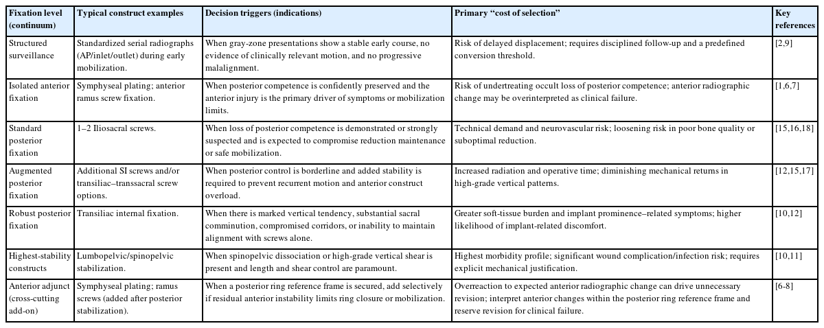 3]. A practical translation begins with behavior. When the ring behaves stably under the available assessment method and the clinical course remains concordant, nonoperative management or limited fixation may be reasonable, depending on morphology and patient factors. When behavior is borderline, standard constructs may be appropriate to protect alignment and facilitate mobilization. When clear mobility is demonstrated or posterior competence is compromised, escalation becomes justified. Throughout, decisions are best interpreted within a posterior ring reference frame [